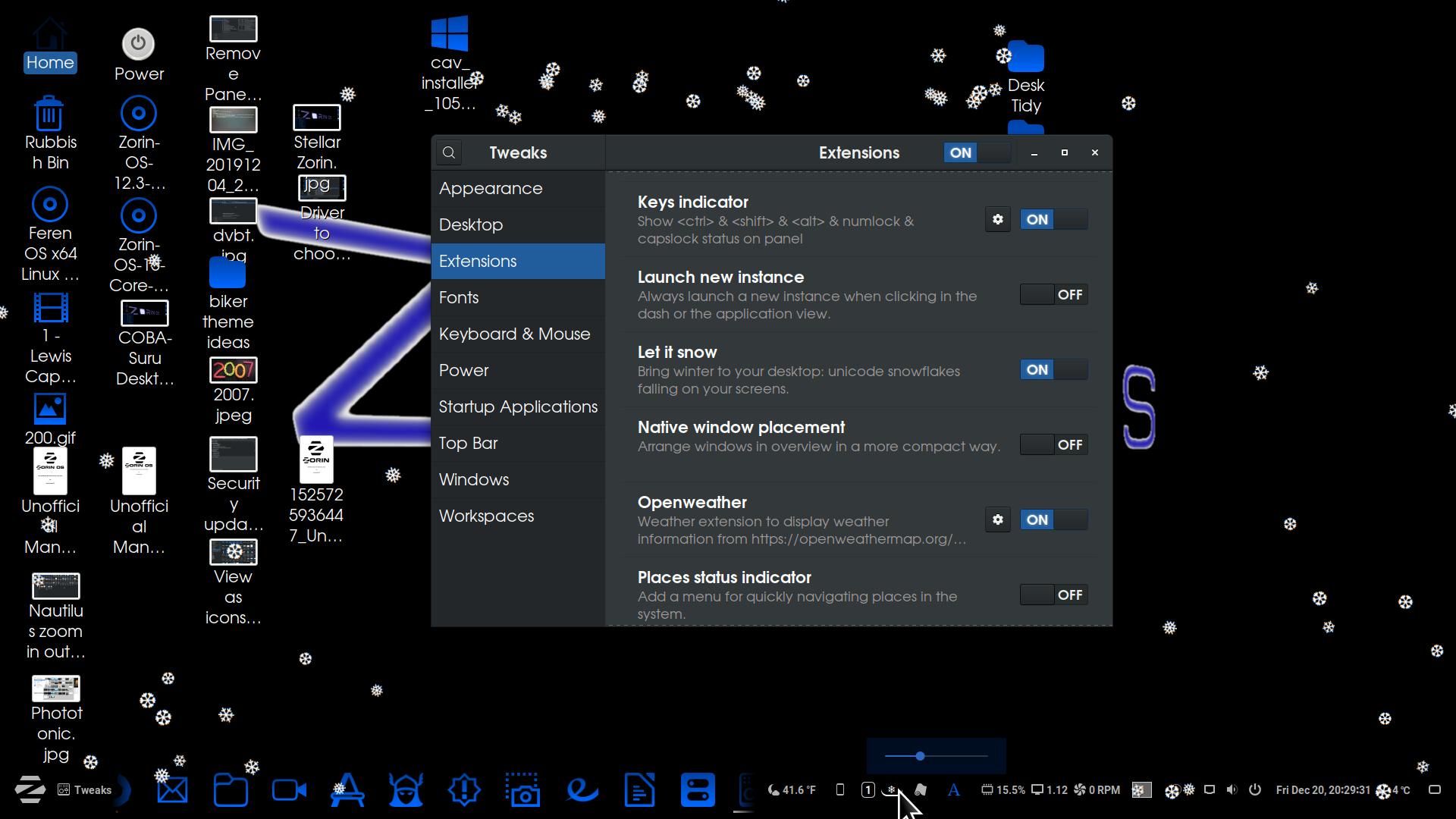 The screenshot shows mouse pointer over the extension that gets placed in the panel - this allows how much, little, or none at all of the falling snowflakes.
