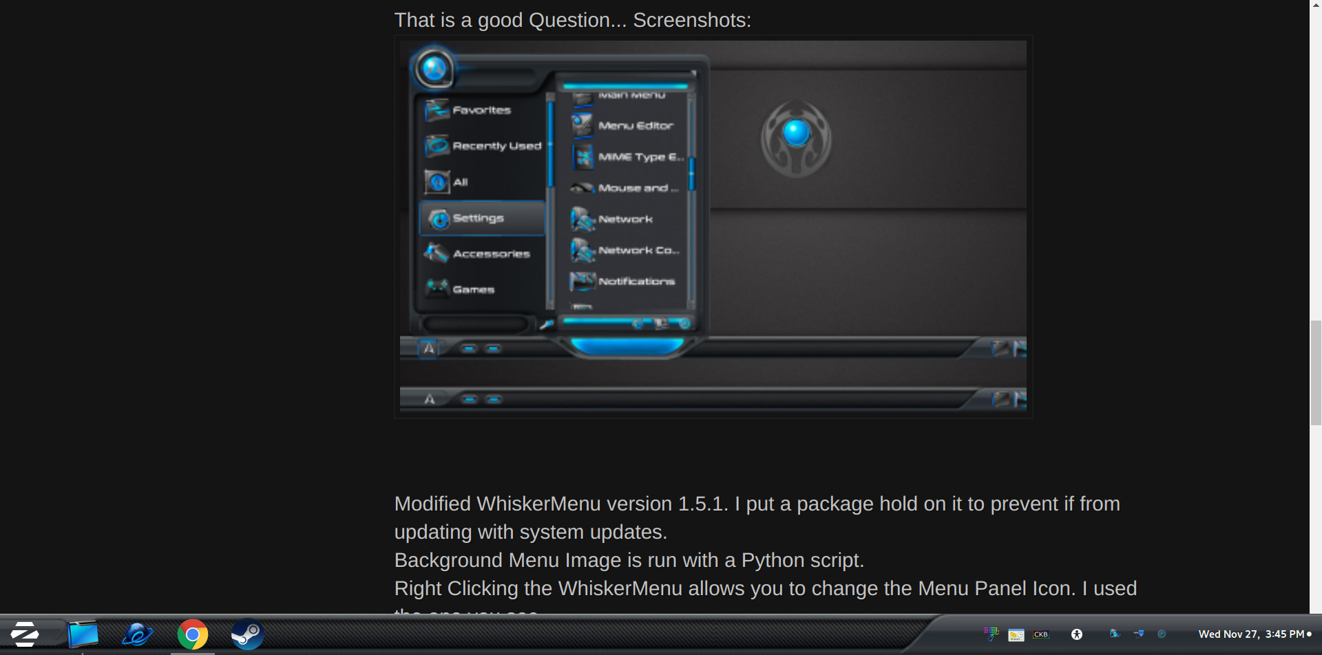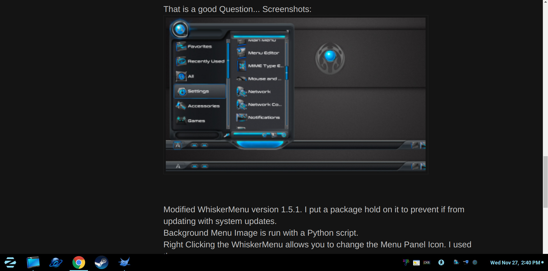 Modified WhiskerMenu version 1.5.1. I put a package hold on it to prevent if from updating with system updates.