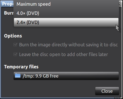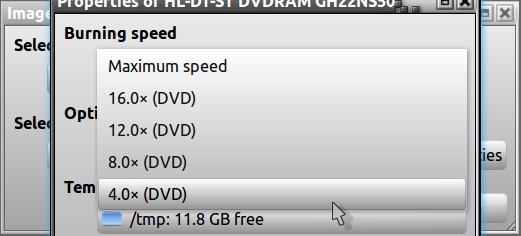 Using Brasero burning app, you should see something like this window after clicking on "Properties" and as you can see, there are several options of which you should select the lowest number, in the this case 4 X: