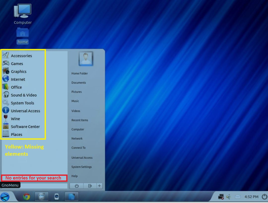 When i click on the Z Orb the Launcher opens up and at the beginning everything was fine but now i don't see any Applications on the right side of the launcher (I'm using slicknesS and Slawomir). At the bottom of the launcher where you can insert a search query it says (roughly translated) "no entries found". Hitting the "Back"-Button or changing the setting in Gnomenu (e.g. from Slickness to Zorin OS Dark) doesn't affect this.