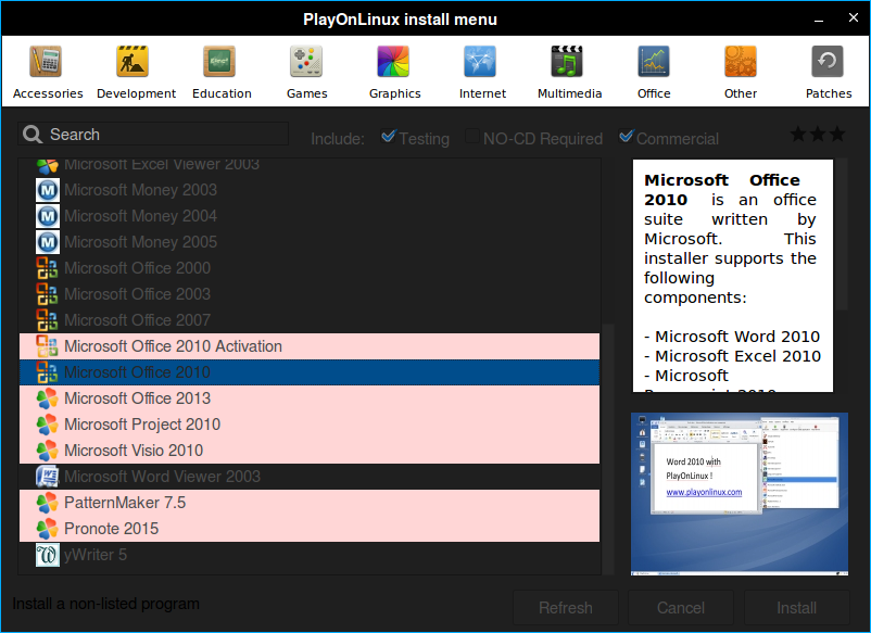 I've an issue with installing MST Office 2010 on Wine, I am new to Linux environment, the installation always replies back with "Installation encourage a problem with installation.. any help please?