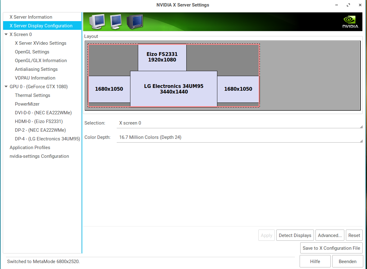 LG 34UM95 via DP 1.2 3440x1440 as primary (all others in extended)