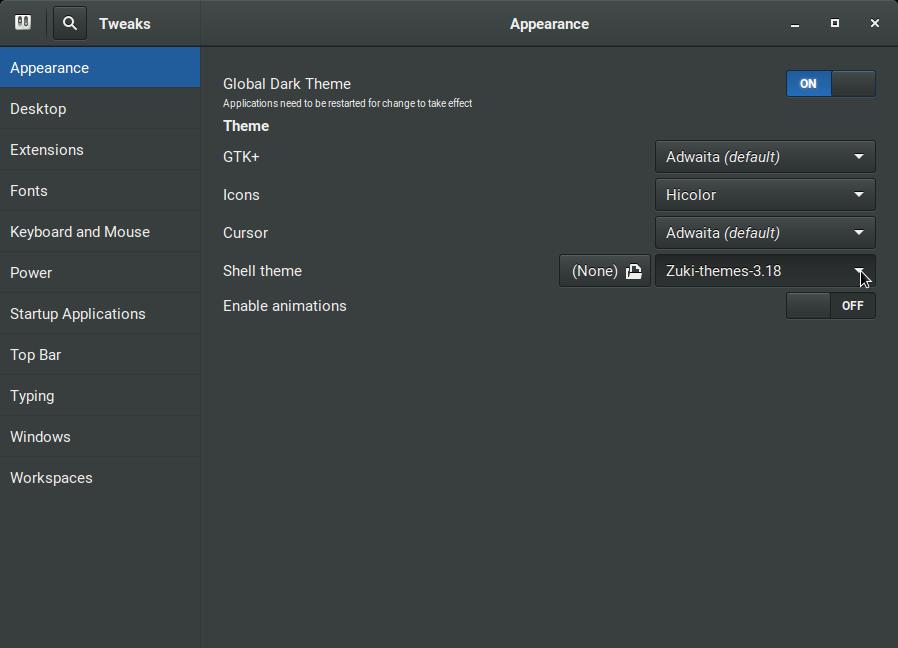 "There was something else that I noticed Tweak Tool > Appearance, there was a black triangle with an internal exclamation mark next to Shell theme – I think that this could be significant – but how do I rectify things? There is no response to clicking the down arrow on the shell theme box."