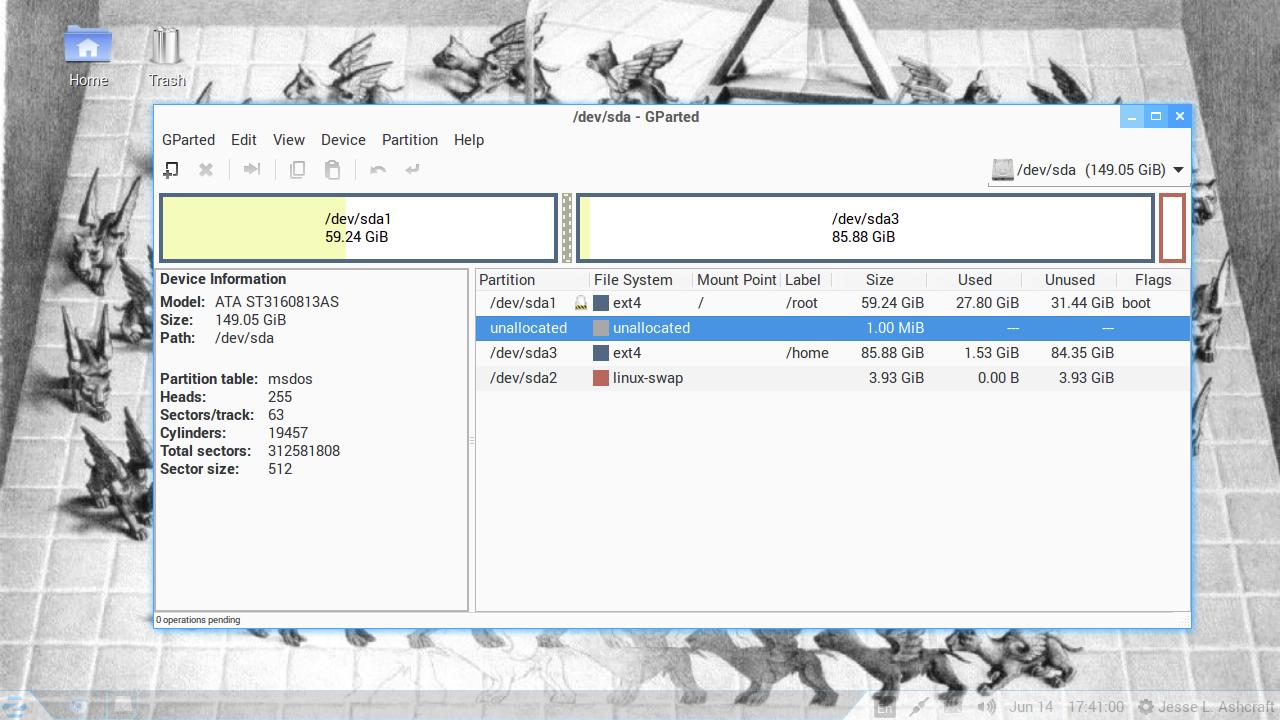 I kept getting a disk space left warning saying I only had about 1 GB remaining. When I called up gParted, it showed I had 1GB left on the root partition, which was originally 30 gig. The home partition was hardly used, so I increased the size of the root by 30 gig (from 30 to @60GB) and reduced the home partition accordingly. Now it looks like this: