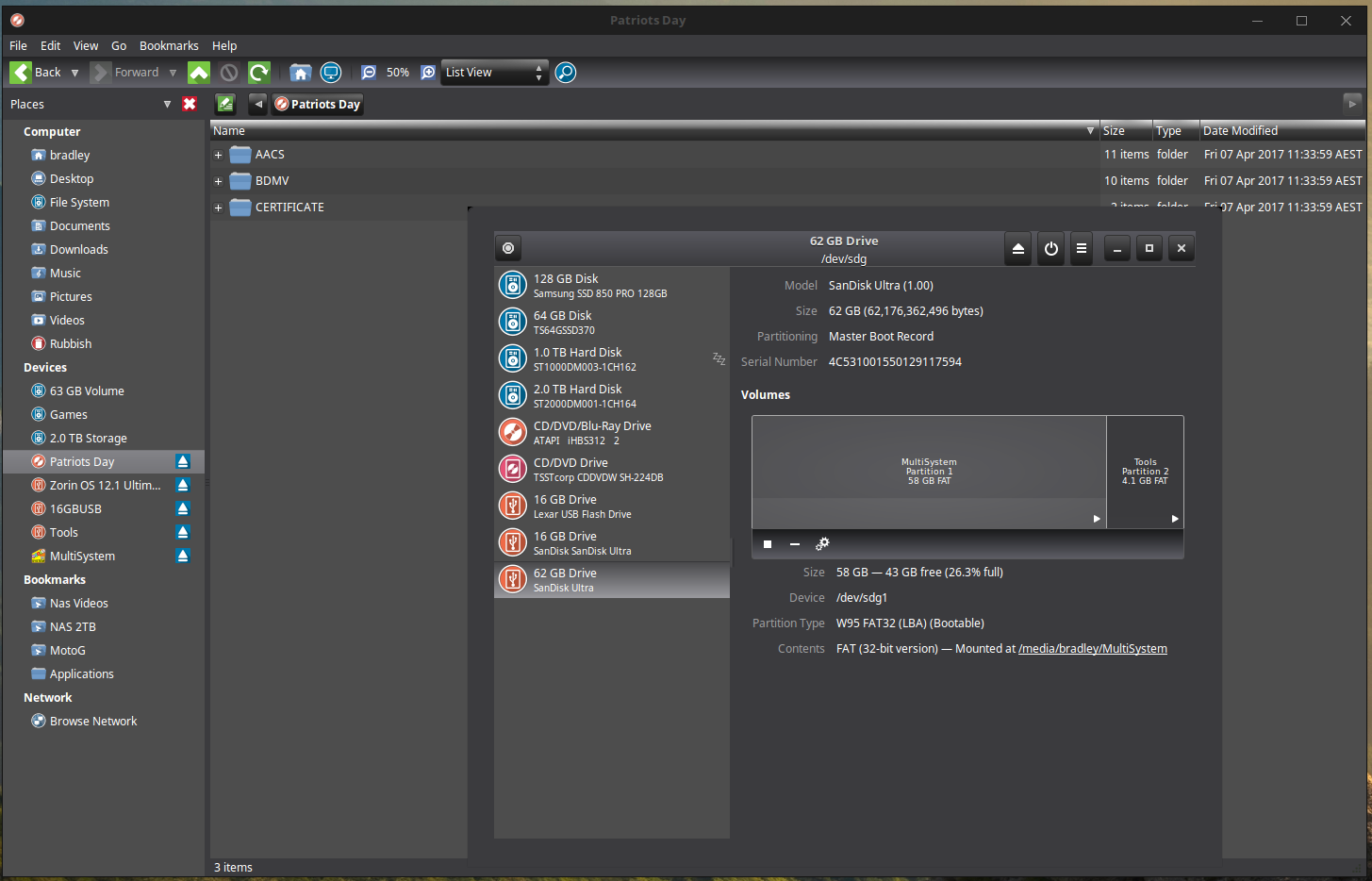 The picture shows my file manger (Caja) in the background with the 'Disks' utility in foreground, I have 'clicked' on the Bluray (Patriots Day) so its content show on the right hand side, but the DVD drive is not present in the FM because it has no disk inserted, yet clearly visible in 'Disks' as CD/DVD Drive, the sixth item down from top.