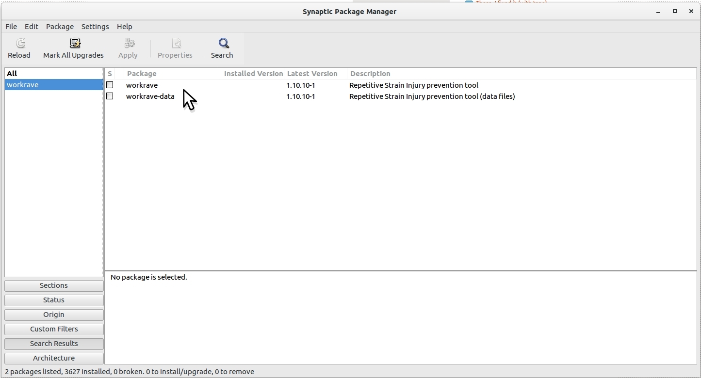 When I used Windows I had a very handy little piece of software called "Workrave", which warned you to take a break at set intervals. It's available for Linux, so I've tried to reinstall it, but it's not working right.