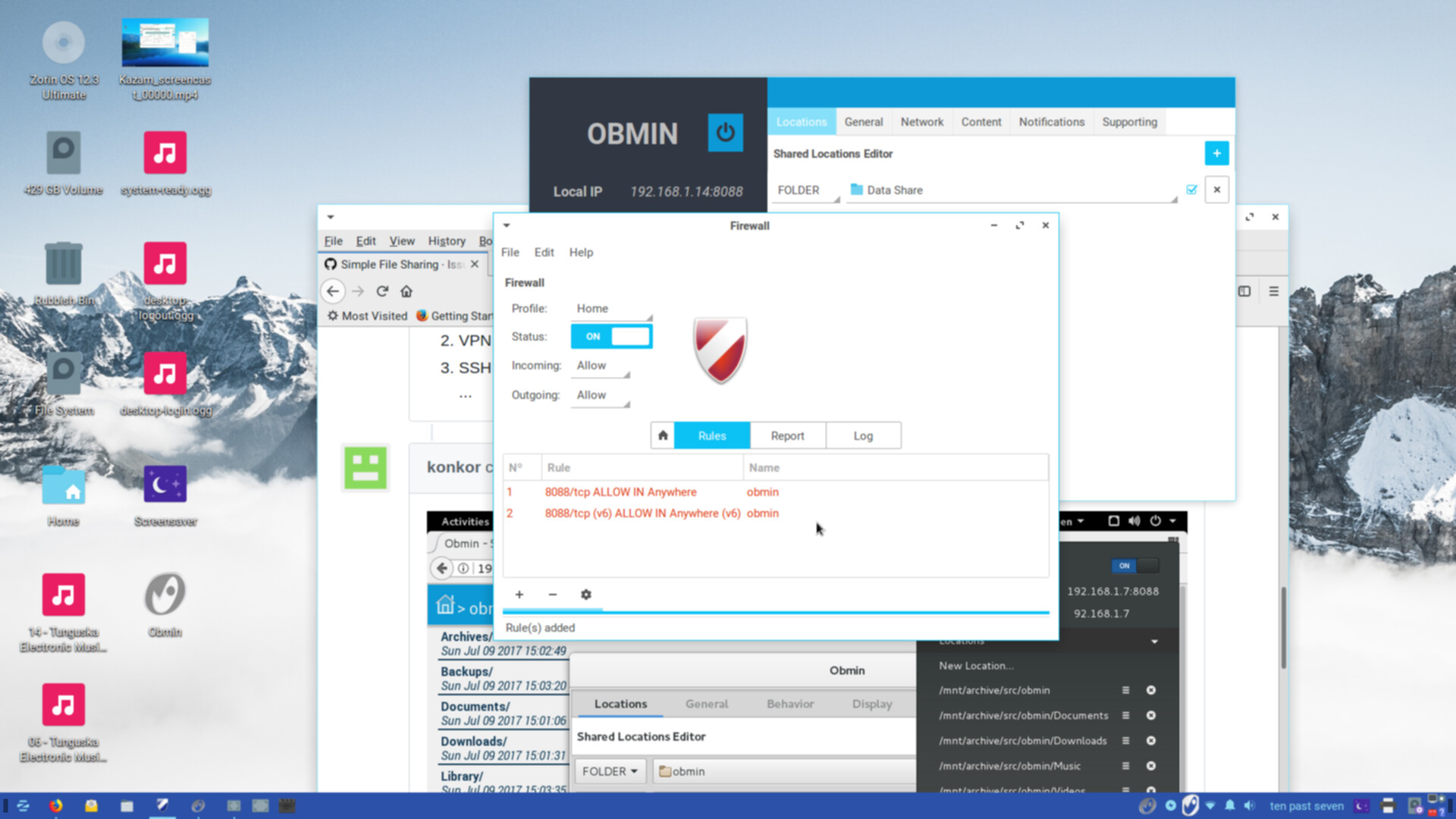 Swarfendor437 wrote:Hi, I am using Zorin Lite Ultimate and NTFS is always mounted for me. To find out if your router supports port forwarding go to manufacturers website and search specification. If not then obmin won't work. The problem with samba sharing is you have to be logged on to the machine each time. OK so you have to be logged on with obmin too but you can leave it running and get your screensaver on with password protection (it usually sets to your login password). I could not get 'share' function on my android phone to dump files so I need to look into this.