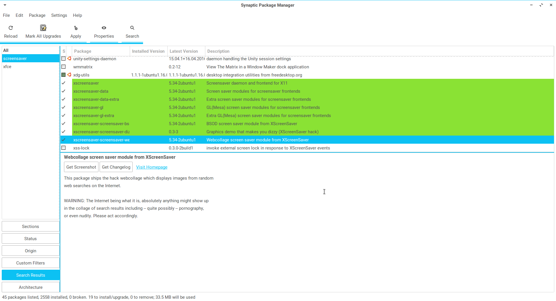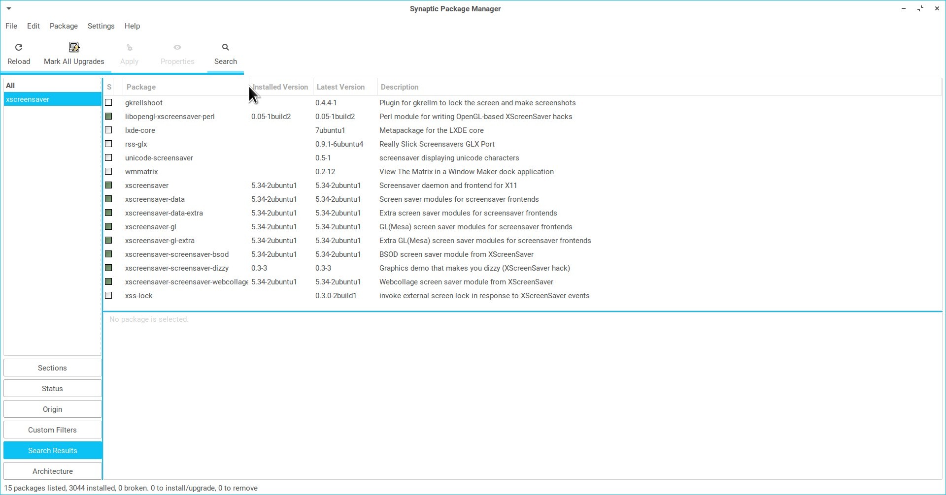 , I only installed the following packages from Synaptic Mannager: xscreensaver; xscreensaver-data, and xscreensaver-gl ( the two firsts are related so when you marked both are selected) the last one I choose it myself since it has a cool "glmatrix" screensaver that was the one I wanted.