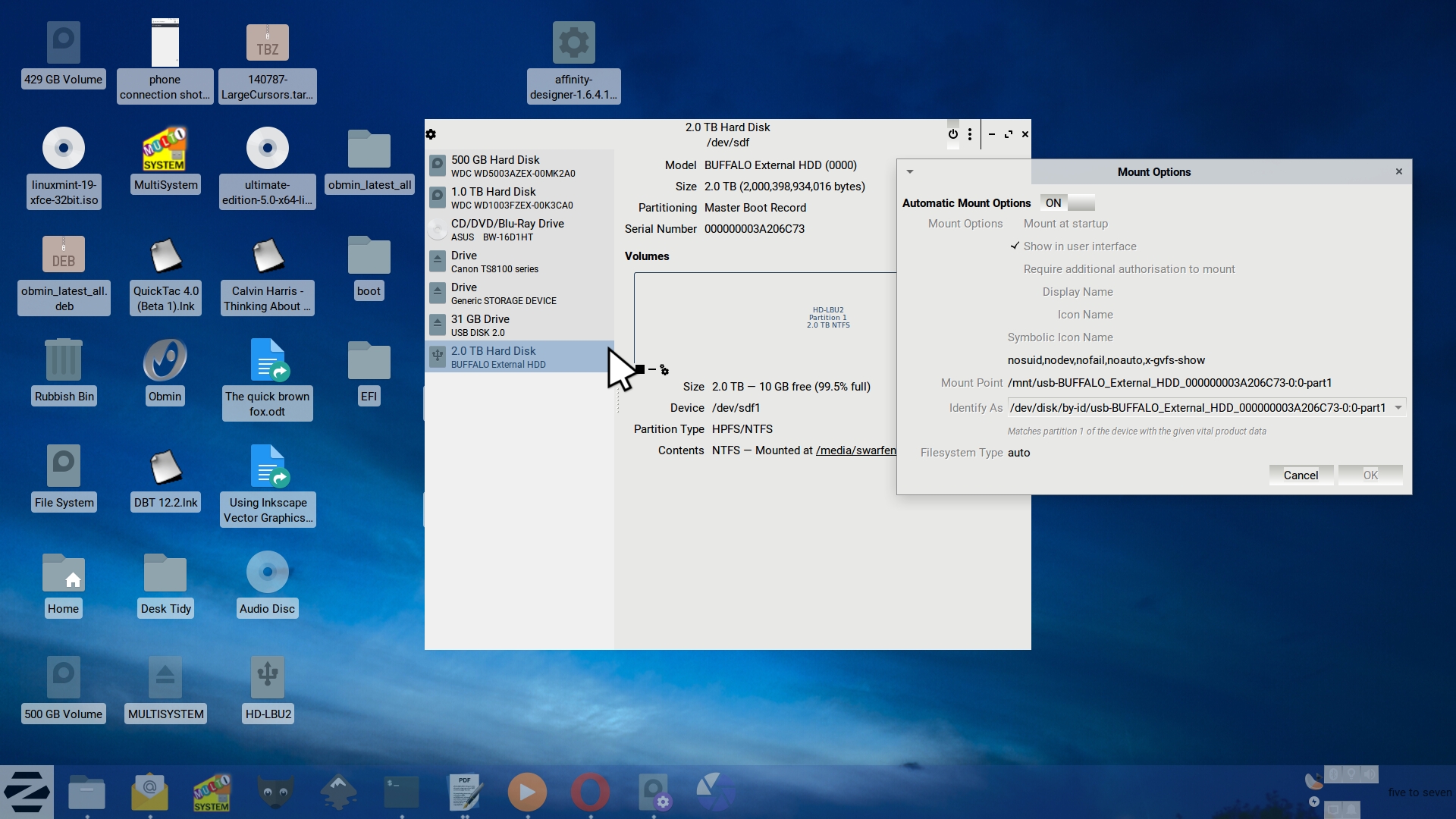 the partition "datos" is mounted in /mnt/755bc4b6-9ba8-4b12-8bcc-0066b2a45f5b, it doesn't mount at start, despite "mont at start is marked".