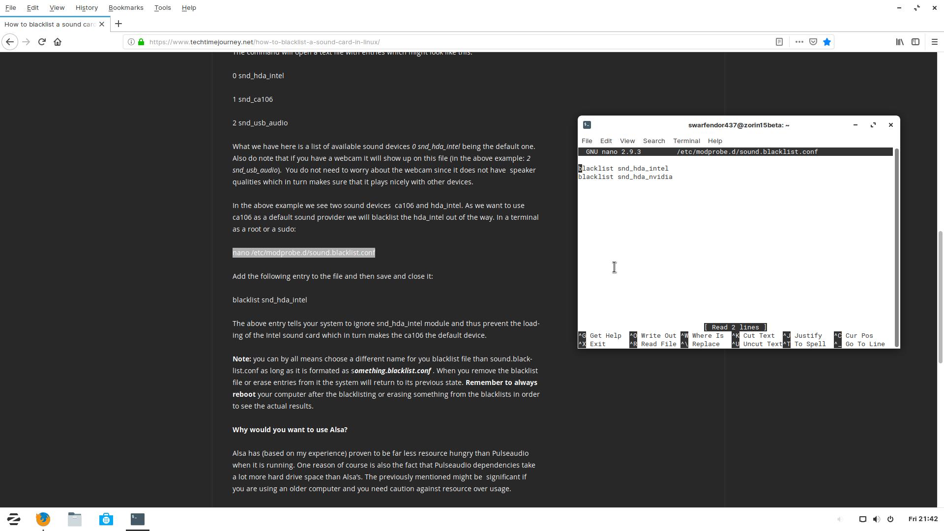 Now to sort things out at the desktop end - you will need to blacklist 'snd_hda_intel' and if you also have a Graphics card with an HDMI connector which will grab the sound before your soundcard you will need to blacklist 'snd_hda_nvidia' too: