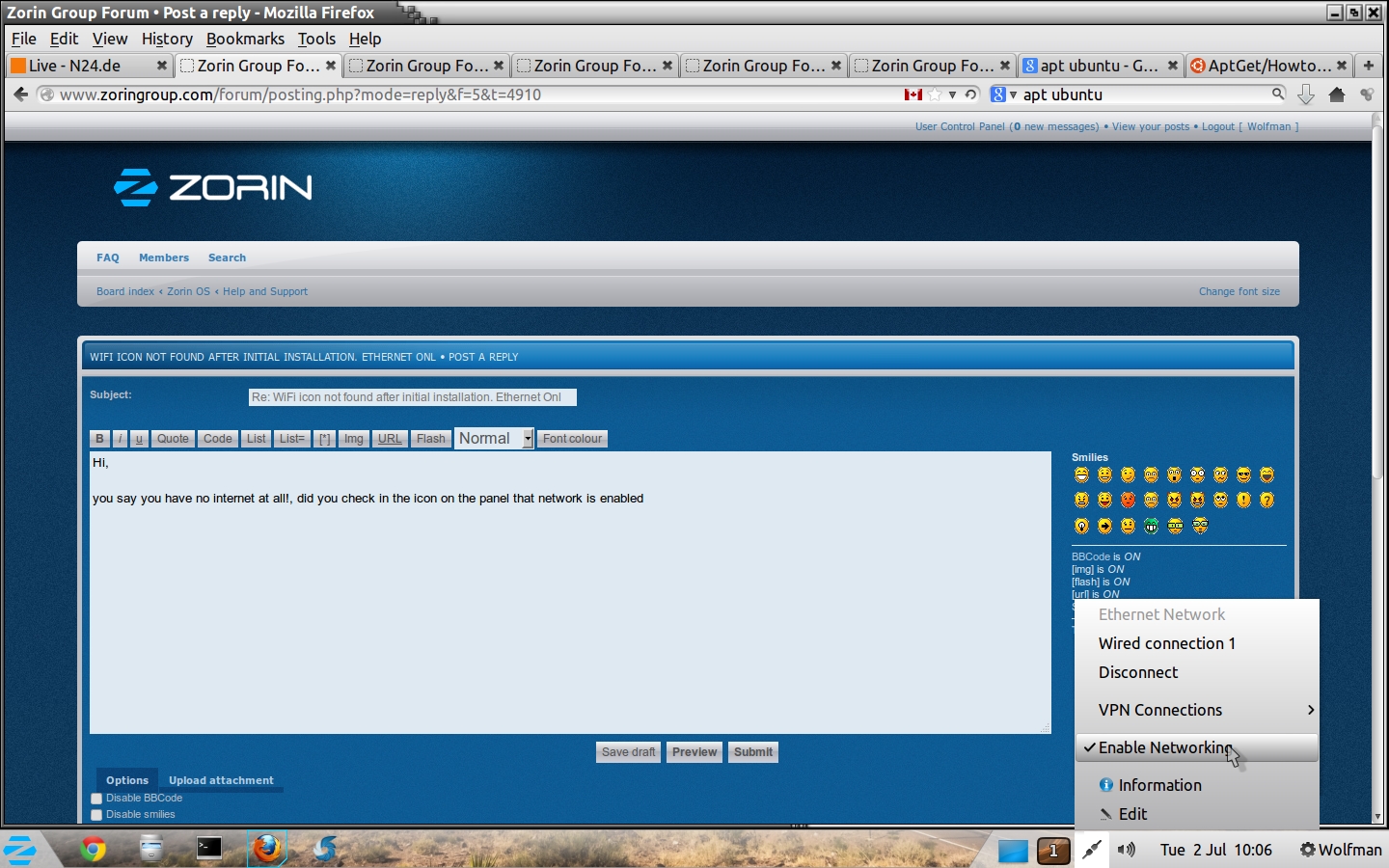 I just finished installing Zorin OS 7. My Ethernet is working. I don't see the WiFi icon available on the lower right corner to connect wireless. Anyone knows how to activate this feature? Thanks