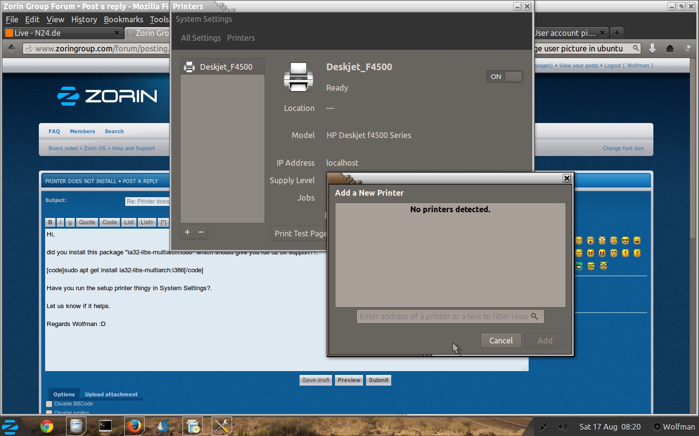 My printer is a Brother MFC4800, and has installed beautifully on all other Linux systems I have installed, but not this system. -- The computer finds it & gives it the correct name for the machine, but can't find drivers. - Having done it numerous times before, I found the the packages in Synaptic, and installed. - Simply nothing happens. It will not even print a test page. - Very strange, especially as it has not been an issue with other distros. -- Absolutely MUST get this working. ....