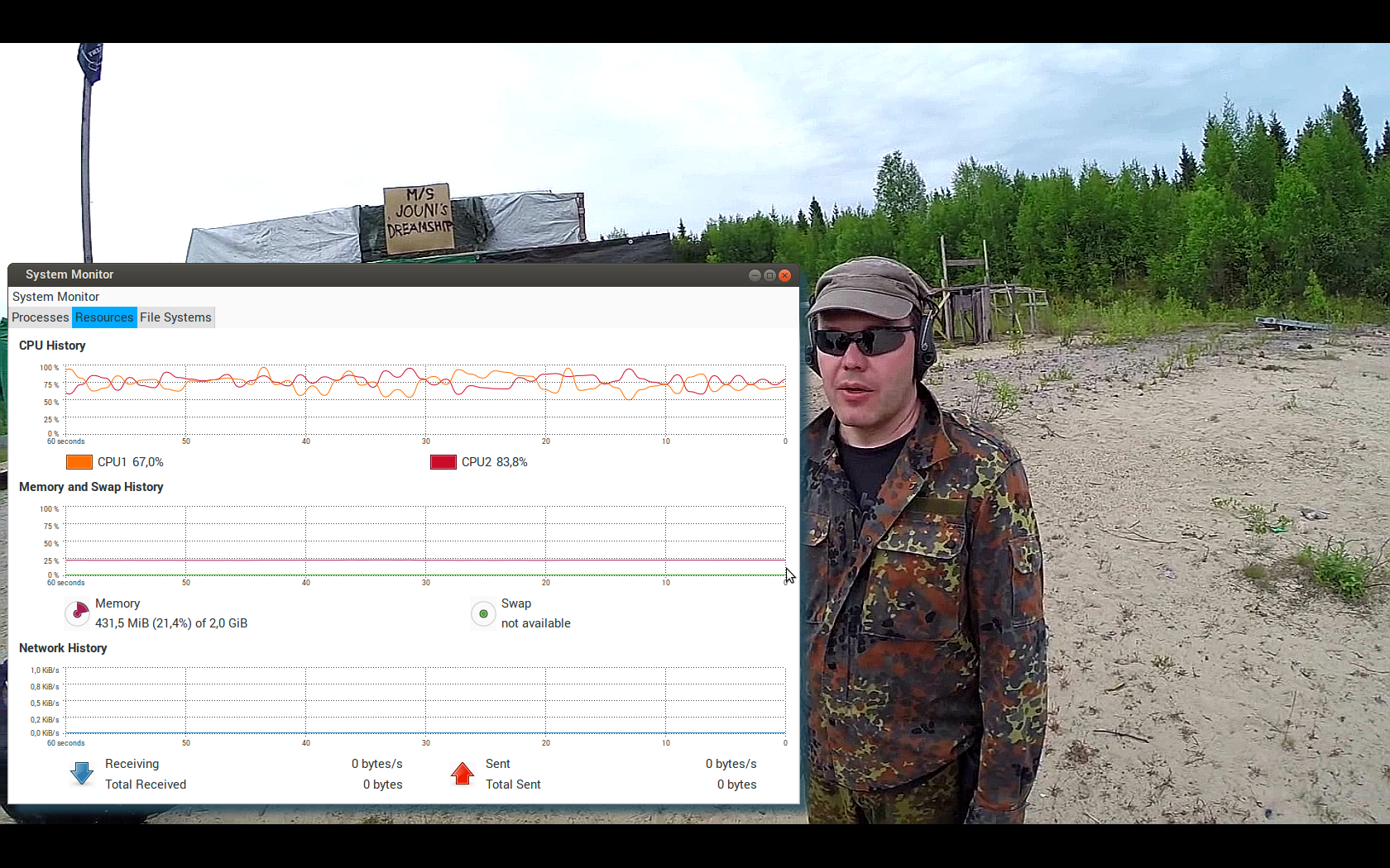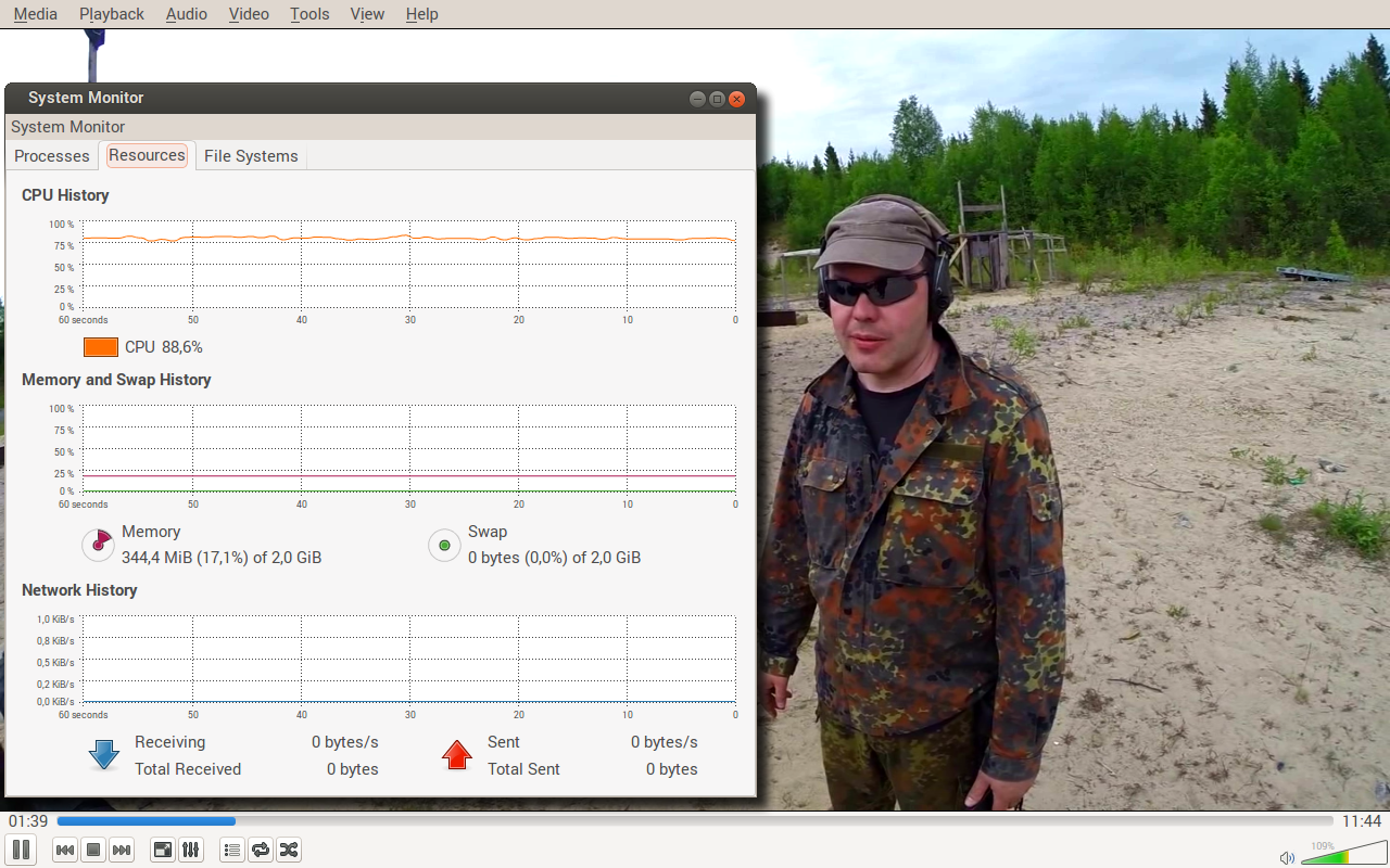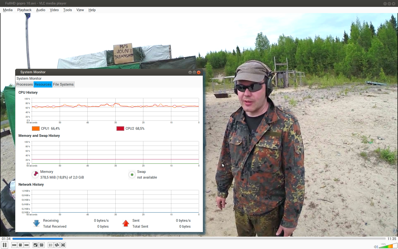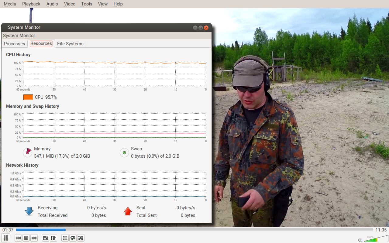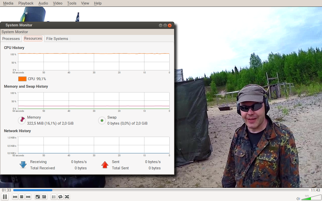 When running a high resolution video. It may run in the computer but if it is still too heavy, so it may not flow properly, it will be choppy. To flow smoothly the CPUs' loading should not be too high. Average value should be some 70 to 75 % and only the peaks near up to 100%. The loading may vary from 50% to 100% depending the speed of movements in the video pictures. The loading can be followed opening from the "System tools" the "System Monitoring" when running the video. With this test videos resolution, format, framerate, bitrate and used player and its settings can be selected to the best running ones. During this test all other applications should be connected off, also the net connection to get the right result.
