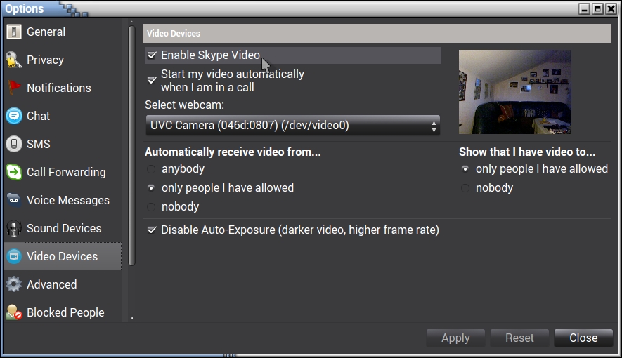 Save and exit the text editor and close the terminal. Now you can open Skype and test your webcam via 'options' then 'video devices'.