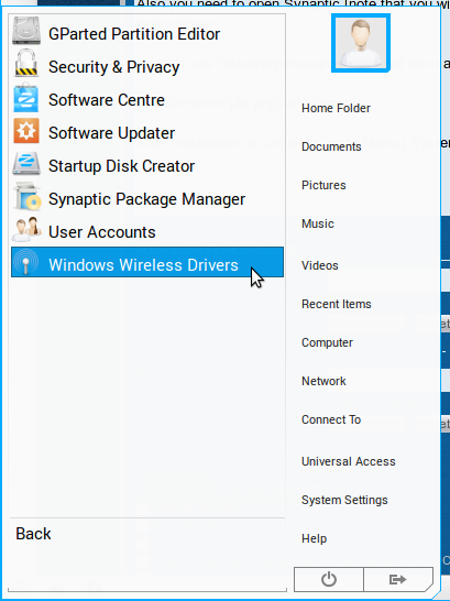 Also you need to open Synaptic [note that you will have to enter your login password to access this as 'root' - administrator], (Menu | System Tools | Administration | Synaptic Package Manager) and in the small search box enter: 'ndiswrapper'