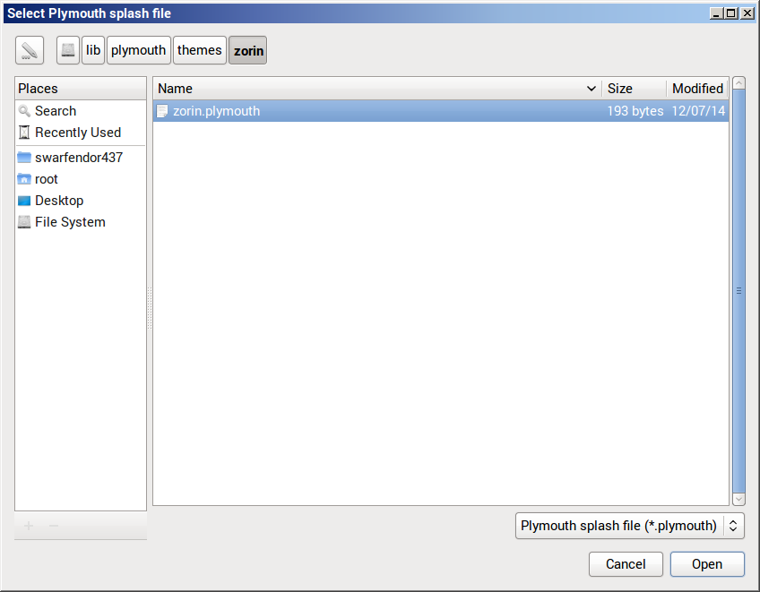 Select 'Change Default Theme' then go to Zorin Folder and select zorin.plymouth: