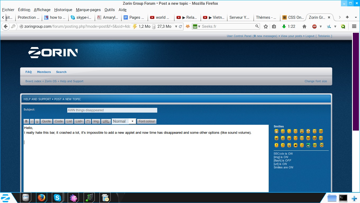 I really dislike this bar taskbar, it crashed a lot, it's impossible to add a new applet and now time has disappeared and some other options (like sound volume).