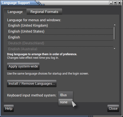 System Settings > Personal > Language Support > Keyboard Input Method System > Change to