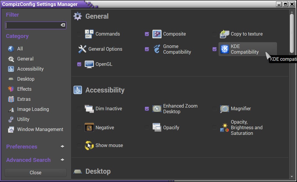 In Compiz it's back and force and up and down to making preferred settings, I get dissy from that..