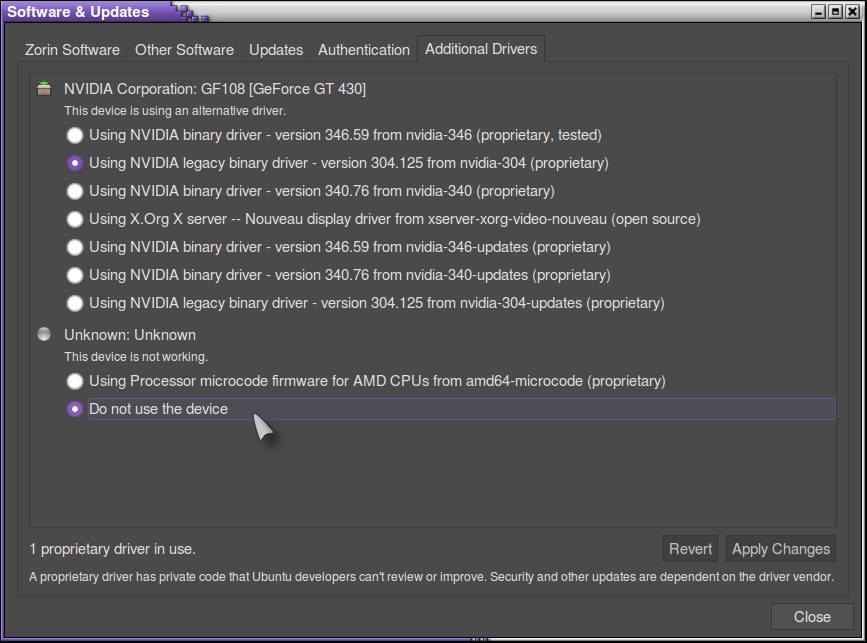 Question: I was working in the Software and Updates utility today and looked at the Additional Drivers tab and noticed there seems to be an additional driver available for what I think is my processor. I attached a shot of the window as it appears to me.