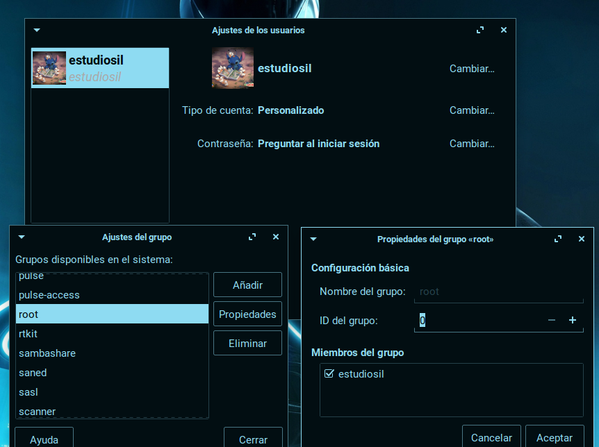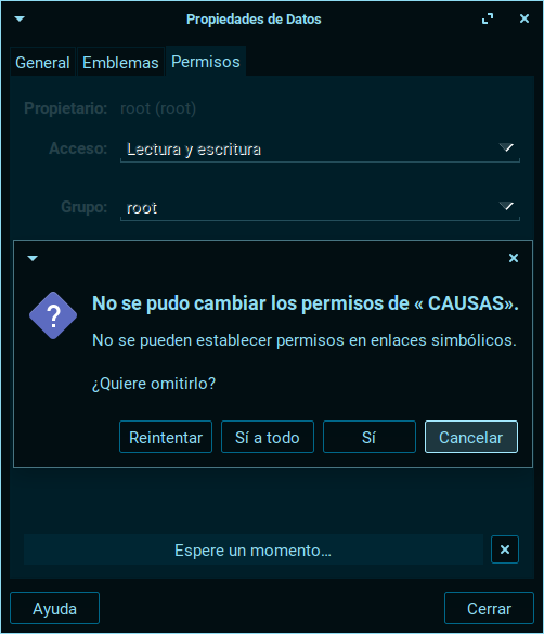 Some advises were shown, regarding the procedure "not being able to apply the permission in xx file, bla bla bla", I just pressed "omit" - "yes" and the process continued. The "owner" of the folder is root ( I will explain about this ahead*) as the group user is the one you see in the picture "<userrname>". Please forgive my screenshots are in Spanish, as my system is, but this mustn't be a problem since you can compare visually and I am explaining here. (patience please)