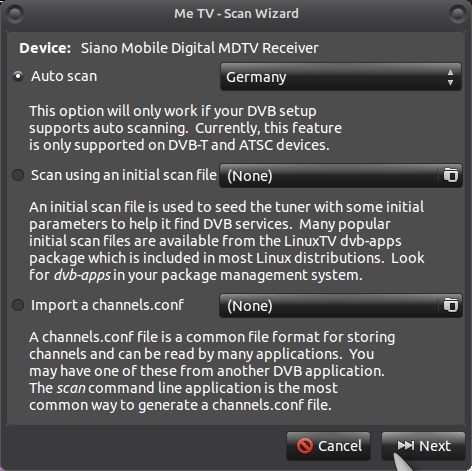Open me-tv and 2 windows will open, the one you need first is the "**Scan wizard**", leave it on "**Autoscan**", select your country and click on "**Next**":