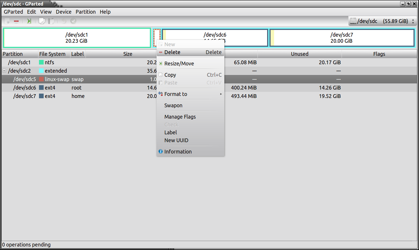 You will now notice that the partitions have a drive letter, /dev/sdc1 is the Windows partition, sdc2 is Extended, sdc5 is swap, sdc6 is root and sdc7 is home, Linux does not use the same method for drive description as Windows and that is why it does not say “C Drive” for the Windows partition. Normally if you only have one hard drive, the drive lettering would be like the very first pic: /dev/sda1 etc