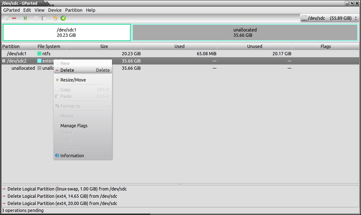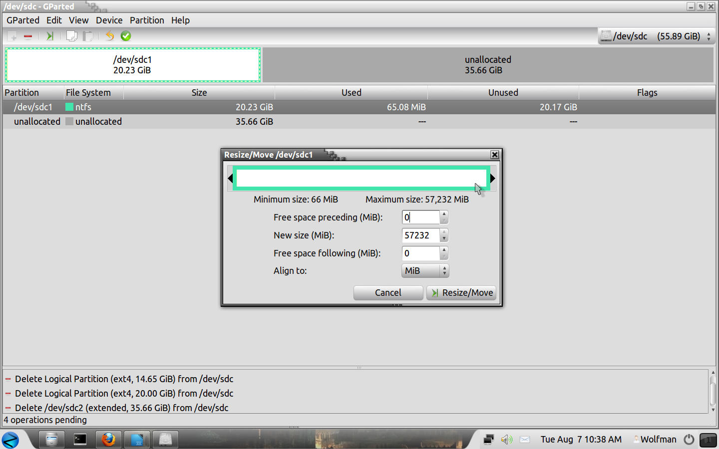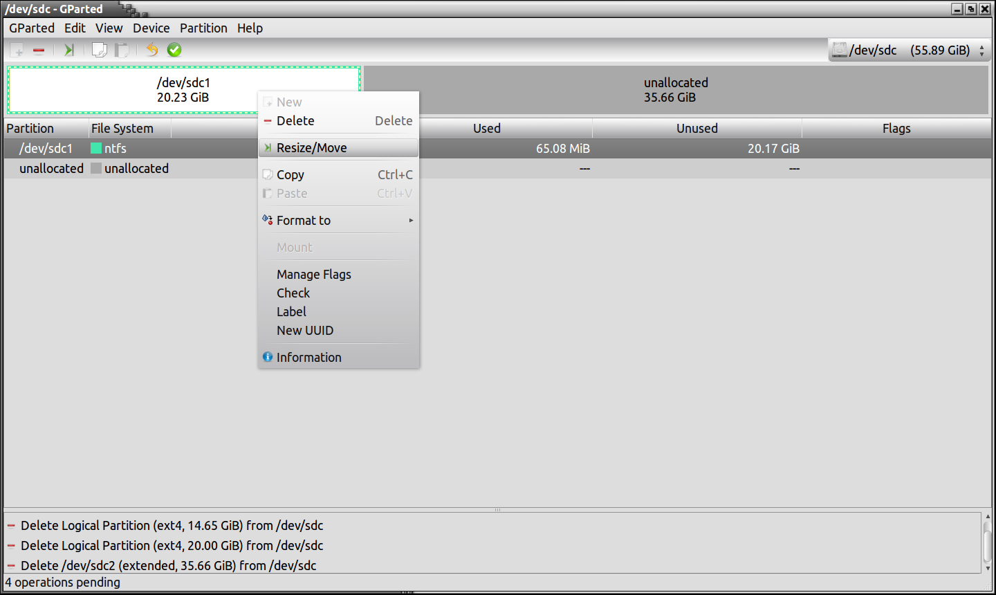 Now, lets resize our Windows partition so we can create our 3 Linux partitions. Right click on the box where it states “/dev/sdc1-55.89Gib” and then on “Resize/Move”, then you simply need to enter the amount of megabytes you would like your new partition size to be, in this case, I have put 20000, which is roughly 20GB, then click the button which states “Resize/Move” and you will now have a smaller partition on the left, and a blank space on the right.