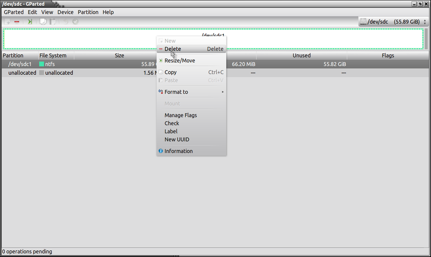 We now want to delete this partition completely, right click on the big box and then on delete.