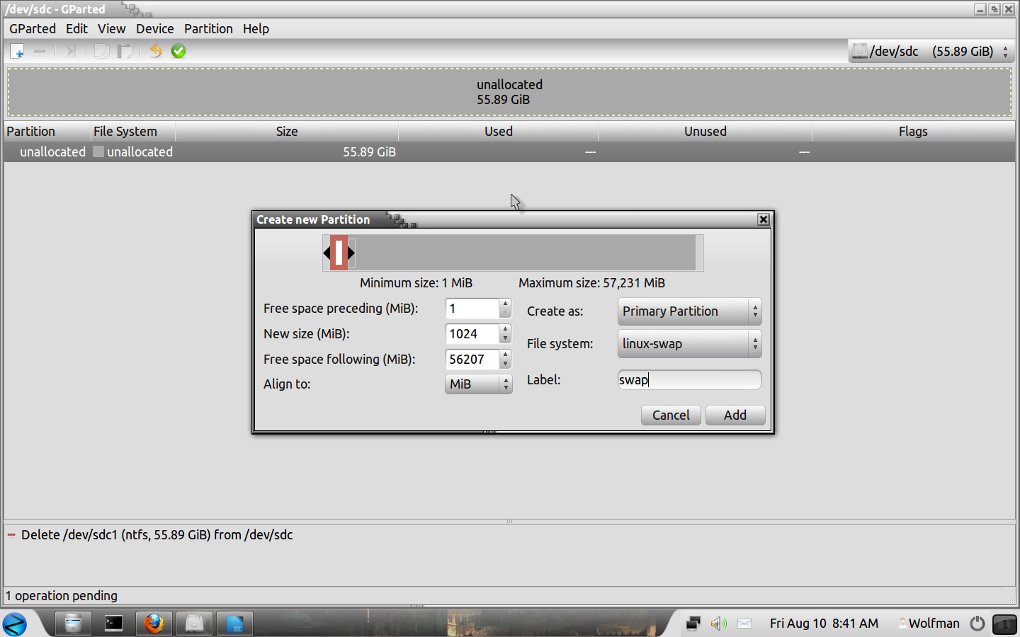 We only need one swap partition, right click on the box then "New", (see part one for swap size) and create our Swap partition.