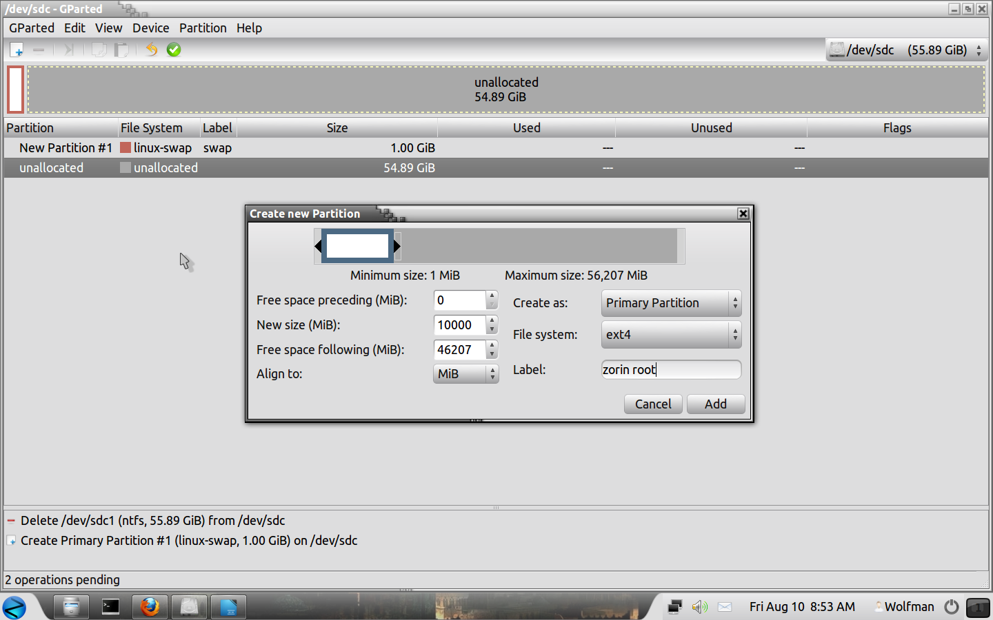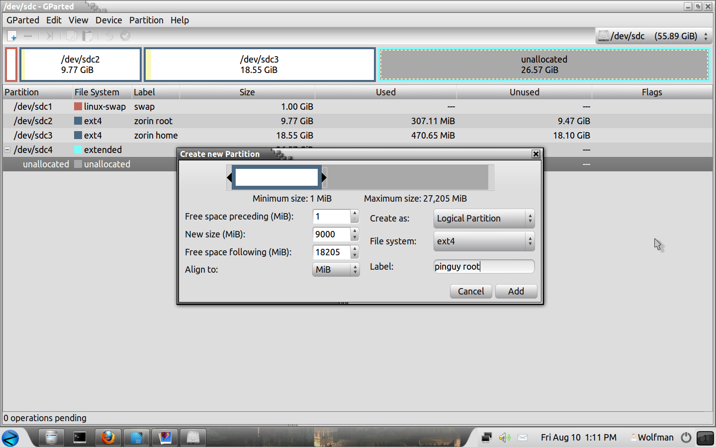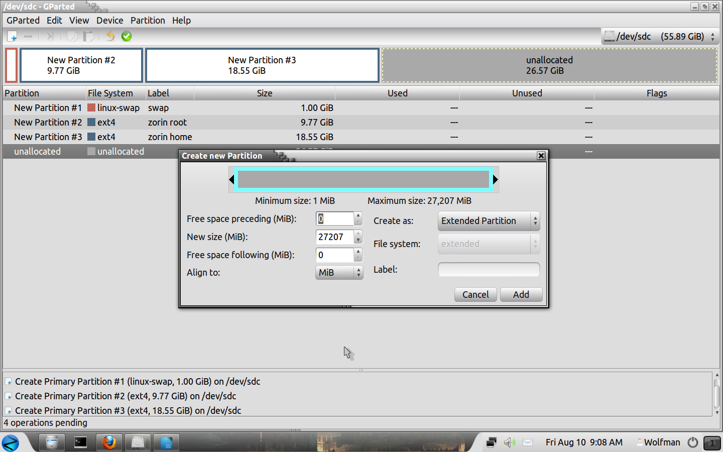 Now we can create our root partition, right click on the box then "New", Create as "Primary Partition". File System = Ext4, Label = zorin root. Click on "Add".