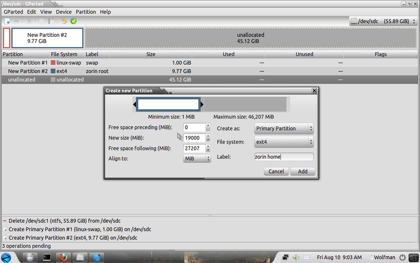 Now we can create our home partition, right click on the box then "New", Create as "Primary Partition". File System = Ext4, Label = zorin home