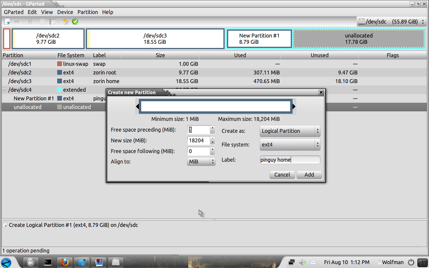 Right click in the remaining space “New” and you can leave the New size as it is as we are going to use the remaining space for our “home” partition, “Create as” is still “Logical Partition and “File system is “ext4”, click on “Add” when finished.
